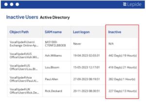 - Detectar usuarios inactivos: Identifica cuentas de usuarios inactivos y genera informes detallados que muestran cuánto tiempo ha estado inactiva cada cuenta y cuándo estuvo activa por última vez.