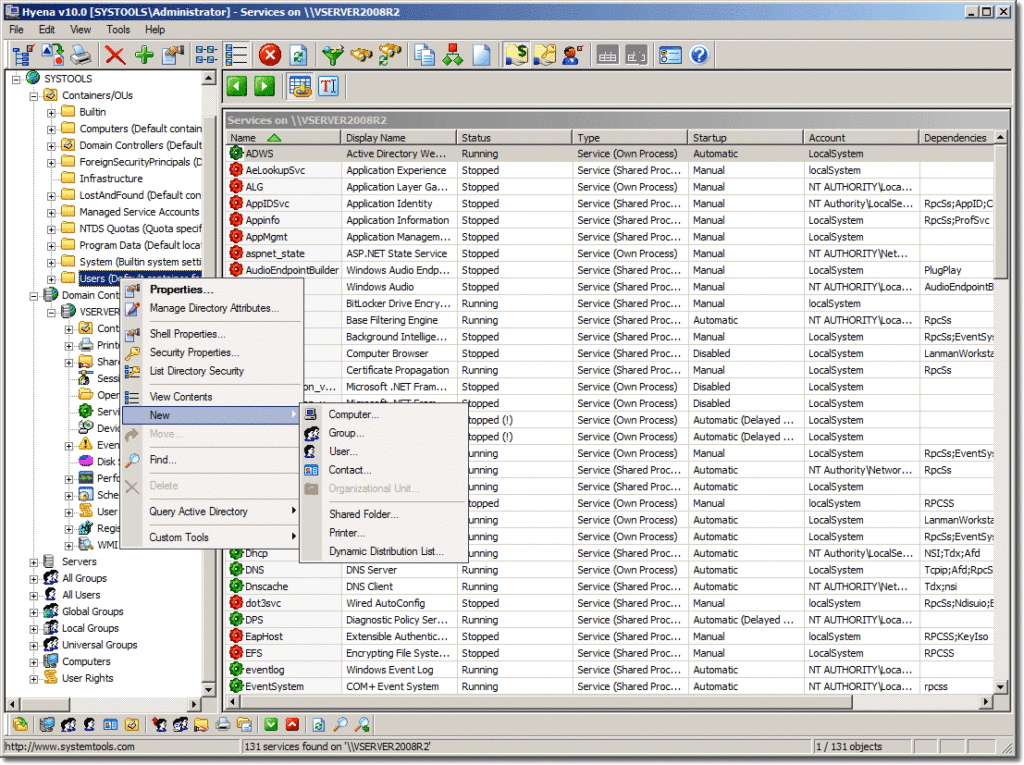 Además de ser compatible con las funciones estándar de administración del sistema de Windows, Hyena también incluye un amplio soporte de Directorio Activo y herramientas de administración.
